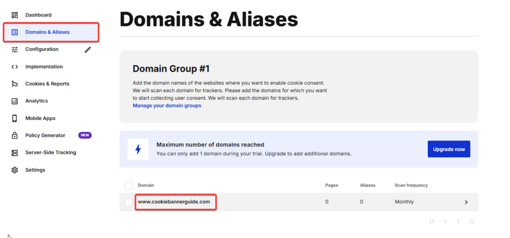 After that, Cookiebot will create a Domain Group for your website.